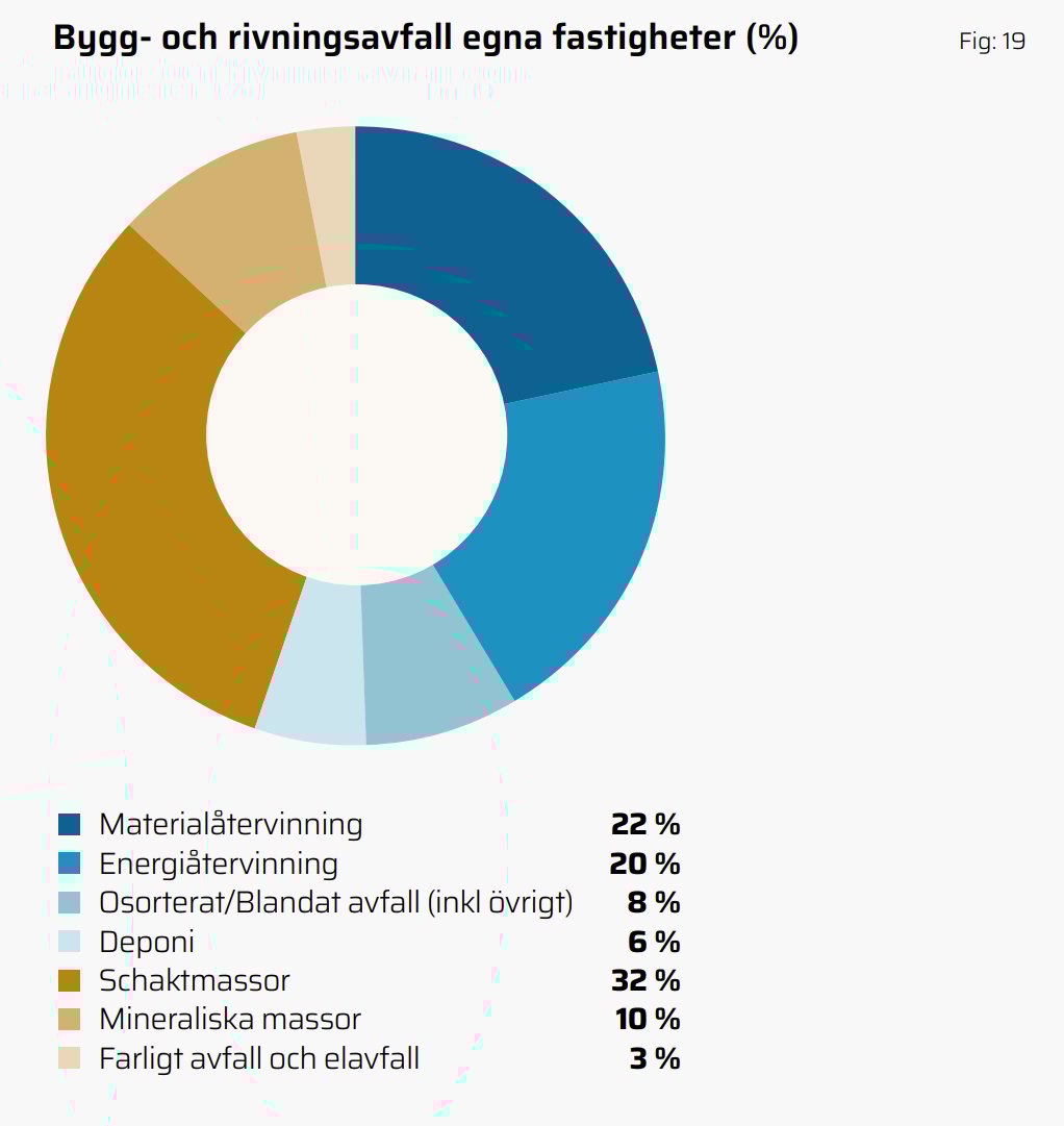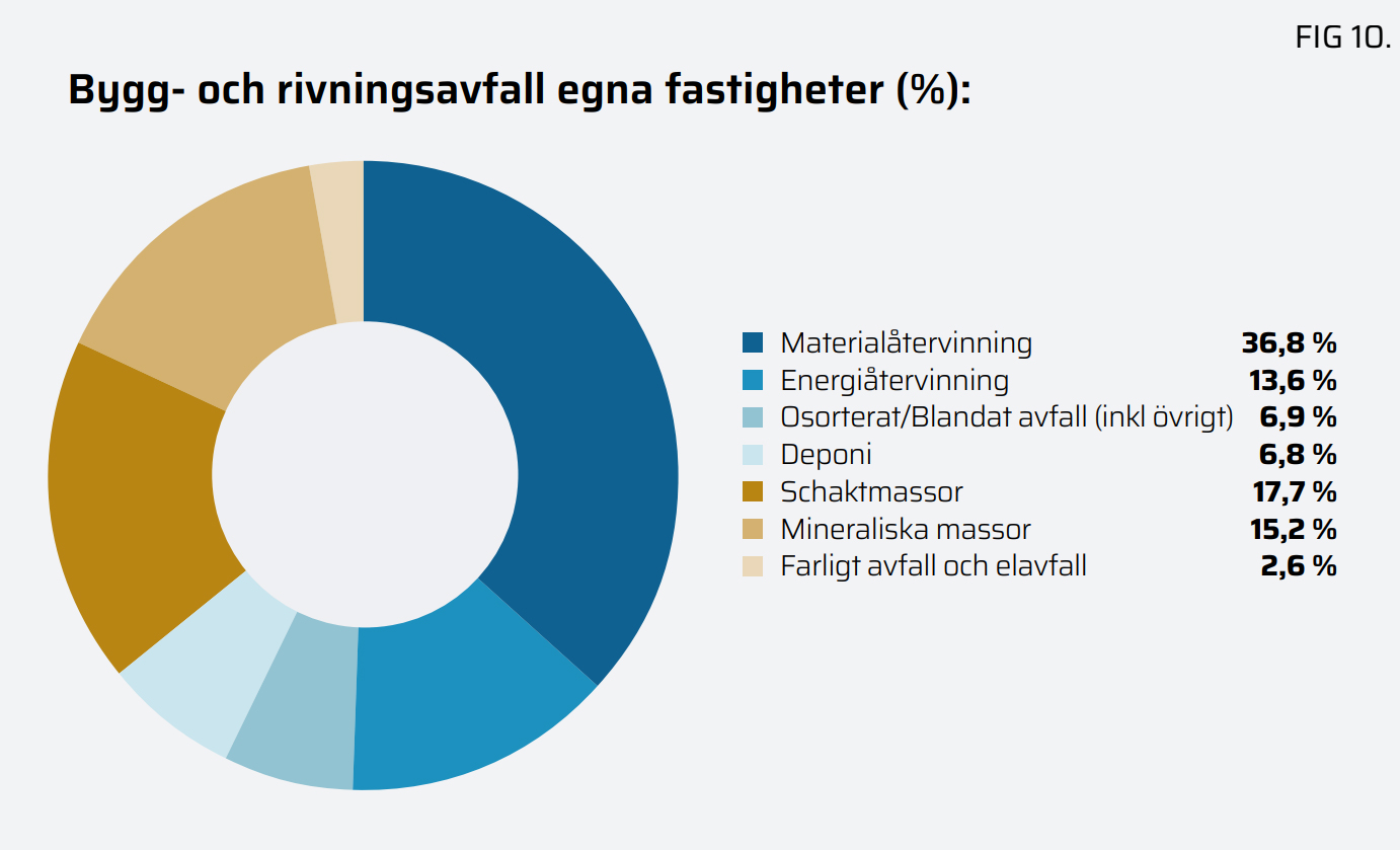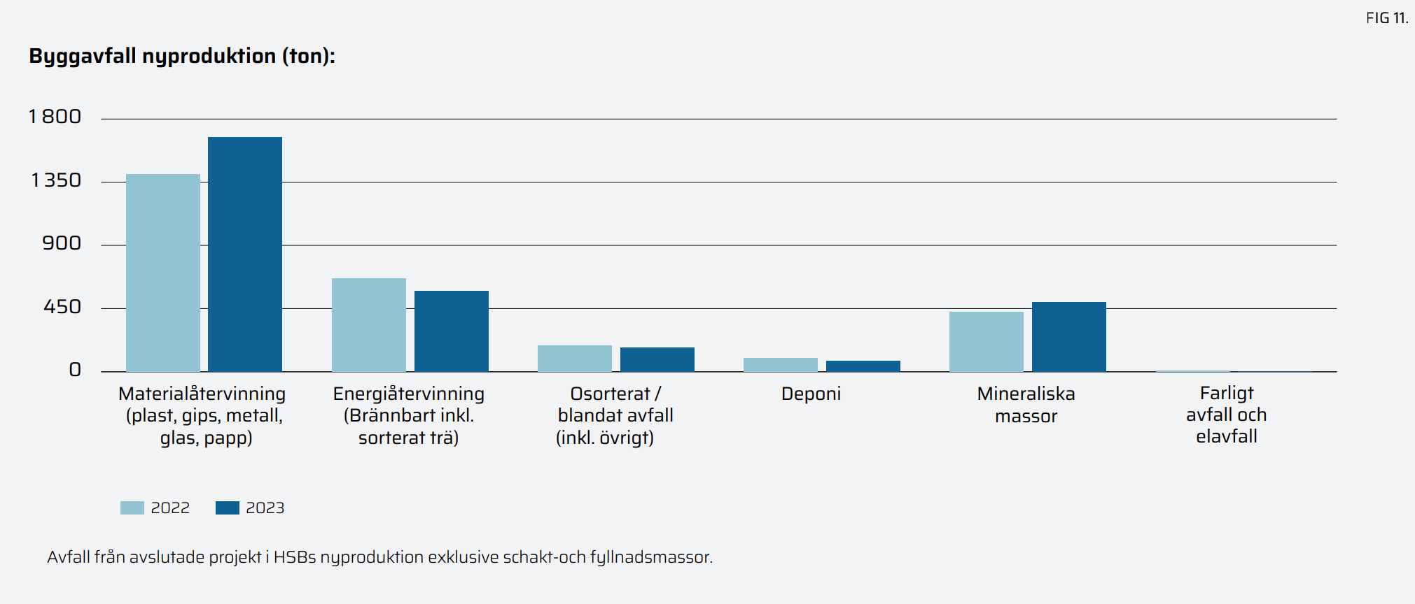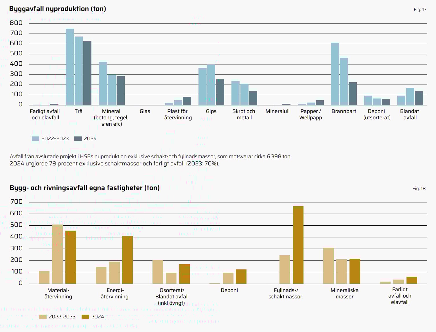 Minimering av byggavfall och omställning till ett cirkulärt byggande med återbruk och återvinning är en förutsättning för ett verkligt effektivt och ansvarsfullt utnyttjande av resurser. HSB arbetar för att mängden byggavfall ska minska och andelen sorterat avfall för materialåtervinning ska öka. Byggavfallet från renovering av HSBs egna fastigheter ökade under 2024, vilket beror på att fler regionföreningar rapporterat avfall från ROT-projekt jämfört med föregående år.