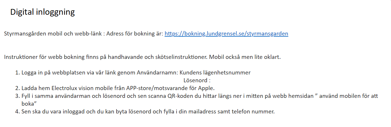 Skulle något gå sönder eller inte fungera som det ska = mejla styrelsen brfstyrmansgården@gmail.com