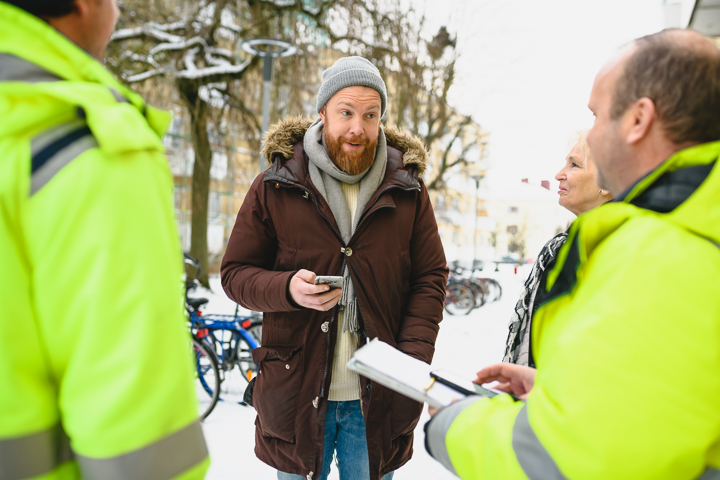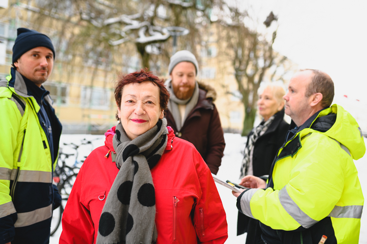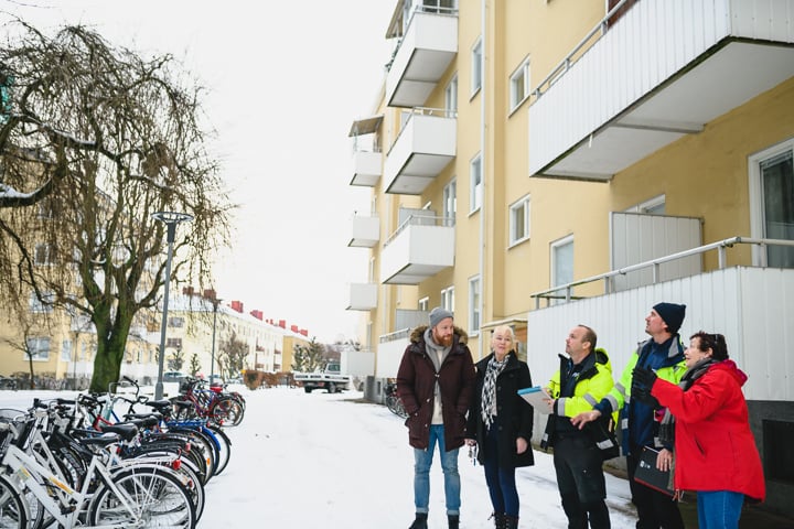 Hon visar runt på gården, pekar och visar vad som ska fixas och förbättras framöver. Snön ligger fortfarande tung över gräsmattor och planteringar. Men så fort våren närmar sig ska föreningen börja med stadsodling. De tänker köpa odlingslådor och bärbuskar till att börja med och hoppas på att medlemmarna vill använda dem. För det gäller att arbeta både stort och smått, i grunden och på höjden, för att få en väl fungerande bostadsrättsförening där medlemmarna trivs.