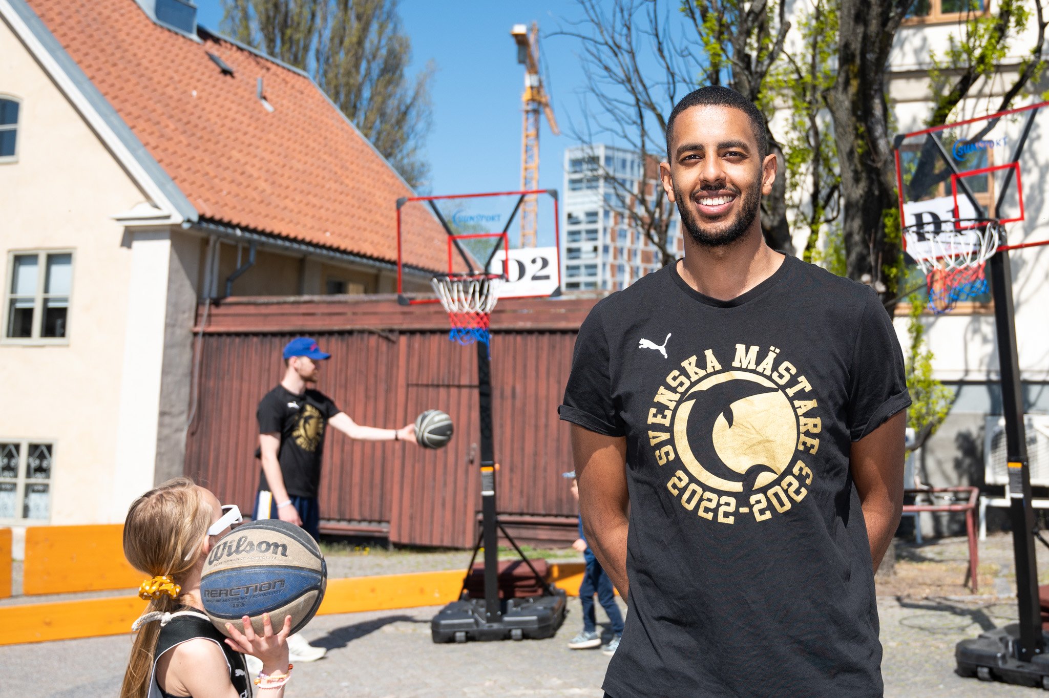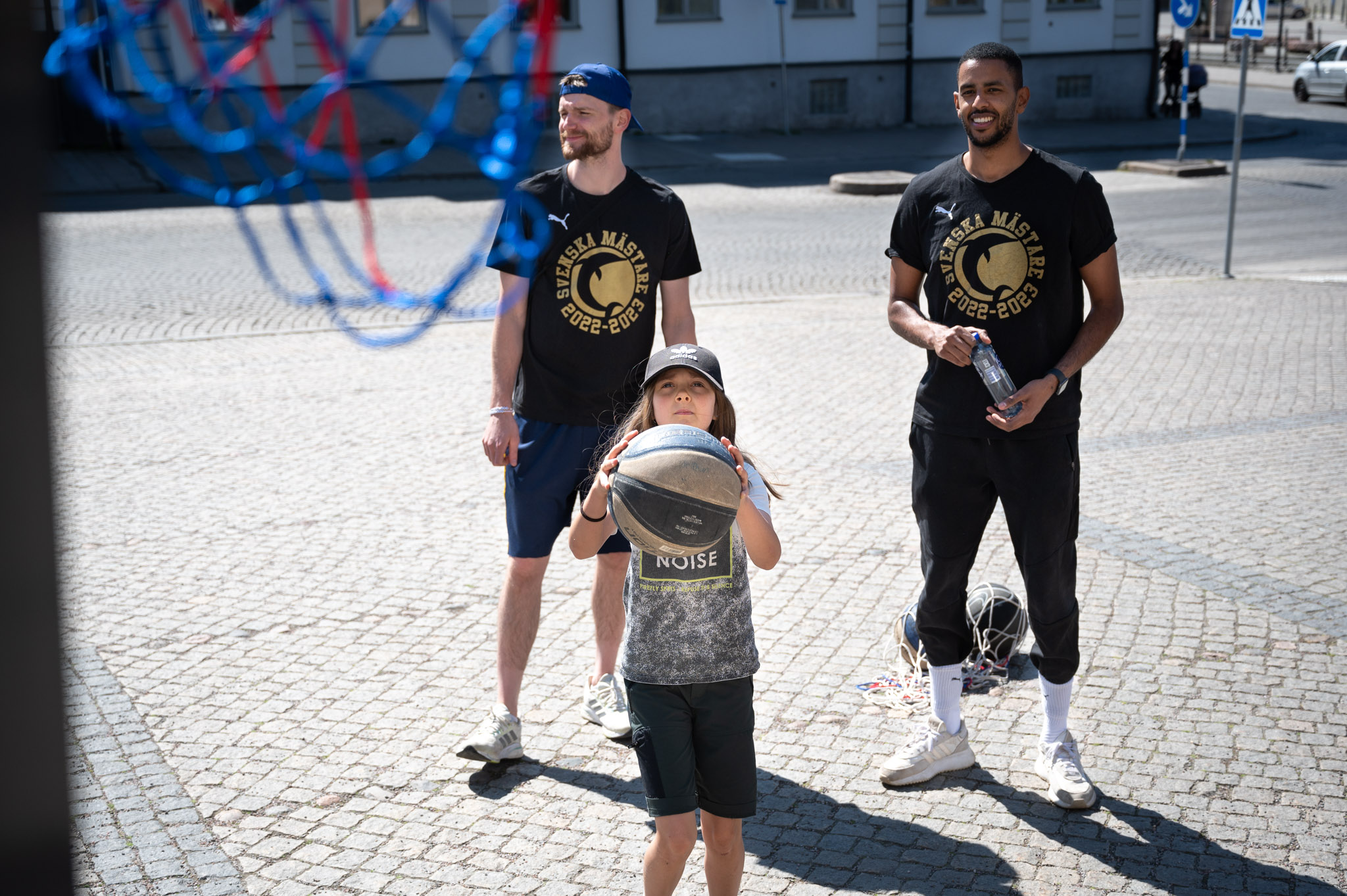 Dolphinsspelaren Nathan Dawit, som varit med och vunnit SM-guld bara några dagar tidigare, var på Gamla Torget för att skriva autografer och öva kast i basketkorgarna med den som ville.
