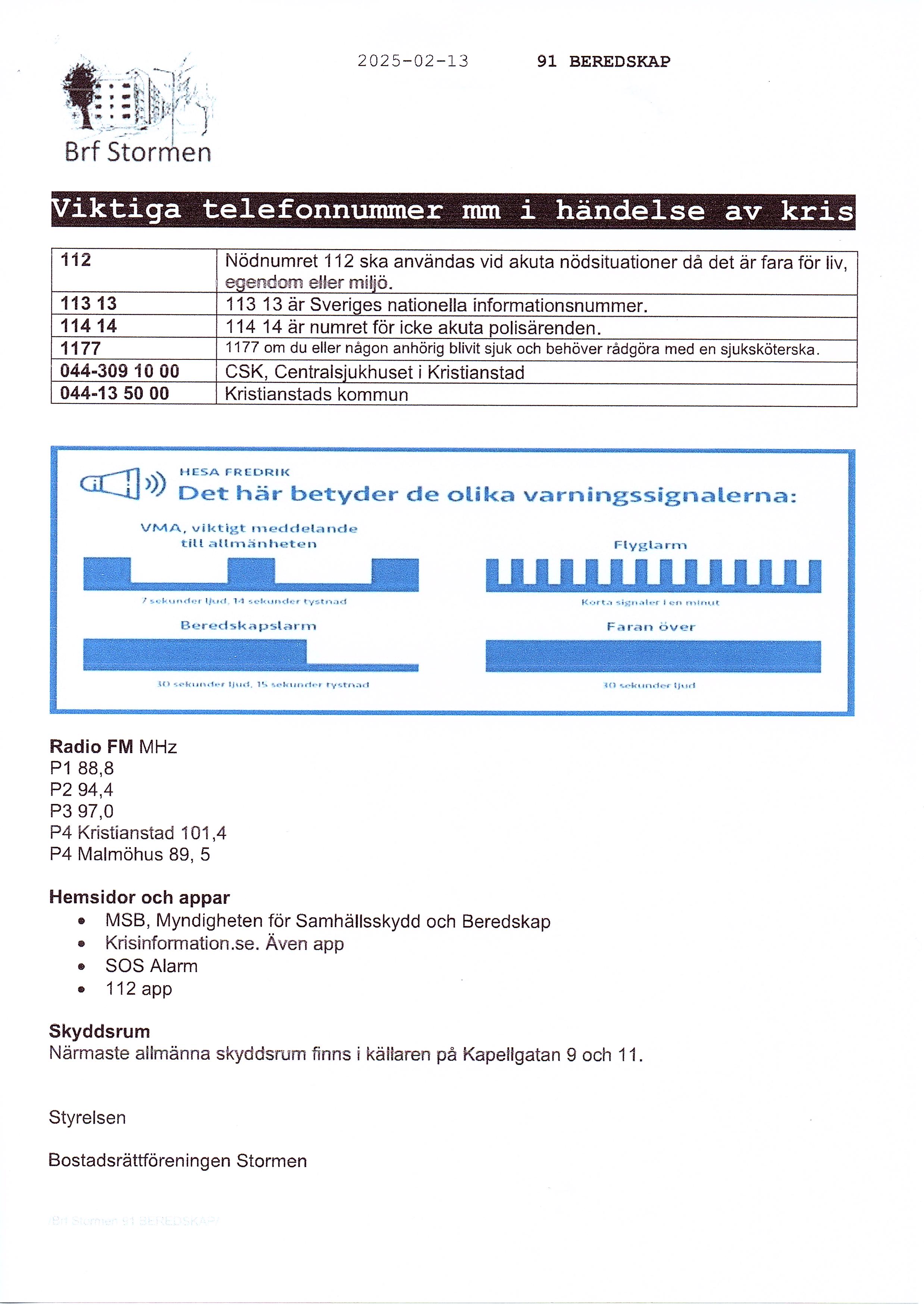 Brf Stormen har en krisplanering som omfattar ledning, brand, vattenläcka, el, värme, beredskap.