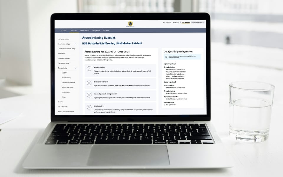HSB tar fram underlaget, besvarar frågor från revisorn och ser till att allt är korrekt. Styrelsen granskar och godkänner slutversionen direkt i Mitt HSB – utan att behöva hantera dokument via e‑post eller fysiska möten.