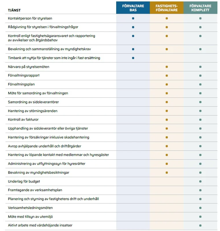 Förvaltare Komplett är vår mest omfattande tjänst, där ni får en strategisk partner som proaktivt arbetar för att optimera fastighetens drift, ekonomi och hållbarhet. Tjänsten inkluderar allt från de tidigare nivåerna samt framtagning av verksamhetsplan och budget, styrning av drift och underhåll, verksamhetsledningsmöten och tillsyn av utemiljö.