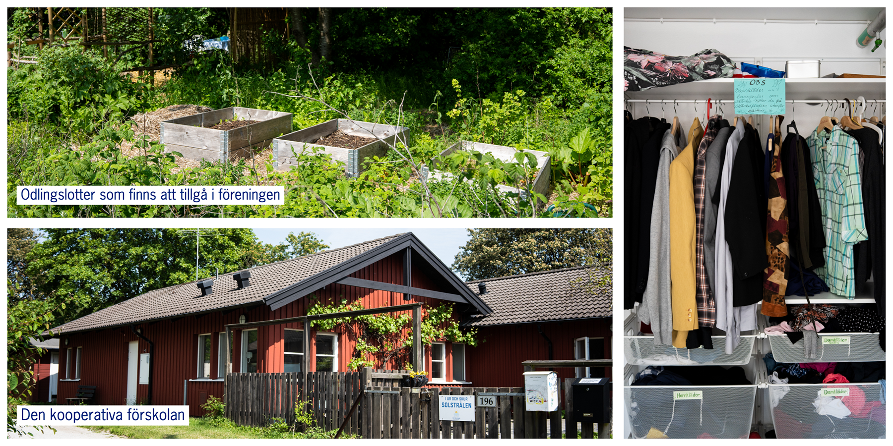 Ingeborg och Jonas berättar bland annat om Solbyns gemensamhetsbyggnad, där tvättstuga, en kooperativ förskola, övernattningsrum och gemensamhetslokal inryms finns även permanent kläd- leksaks- och bokbytarhörnor. Med en förening på 50 lägenheter ryms det flera generationer och olika behov av prylar. Att byta saker med varandra är ett ypperligt sätt att hålla igång cirkulärekonomin på.
