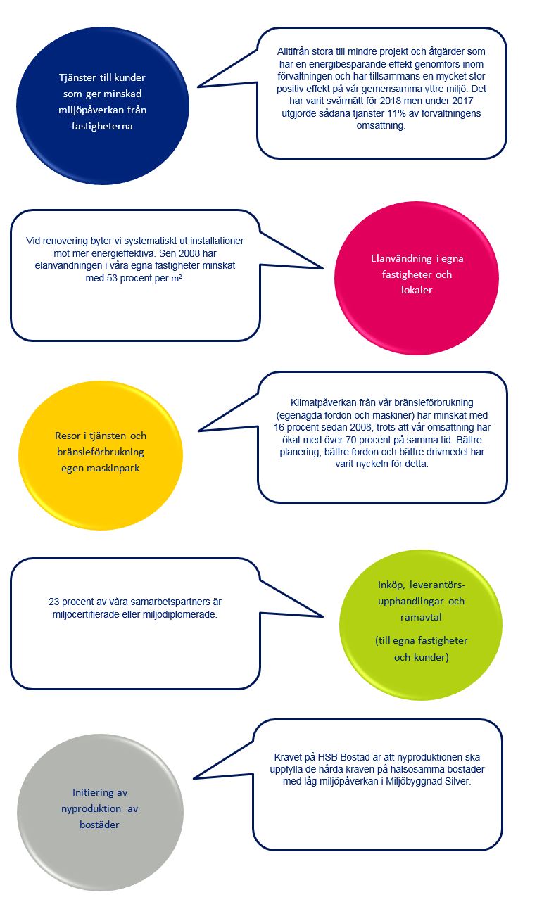 Vi följer varje år upp 19 miljörelaterade nyckeltal, t.ex. energi/kvm i våra egna fastigheter, totala antalet kemikalier i verksamheten, andel matavfall av totala mängden avfall i egna fastigheter osv. Vid senaste mätningen som gäller år 2018 uppnår vi högt uppsatta nivåer inom sju av våra nyckeltal. Vi ser också en förbättring inom sju av nyckeltalen.