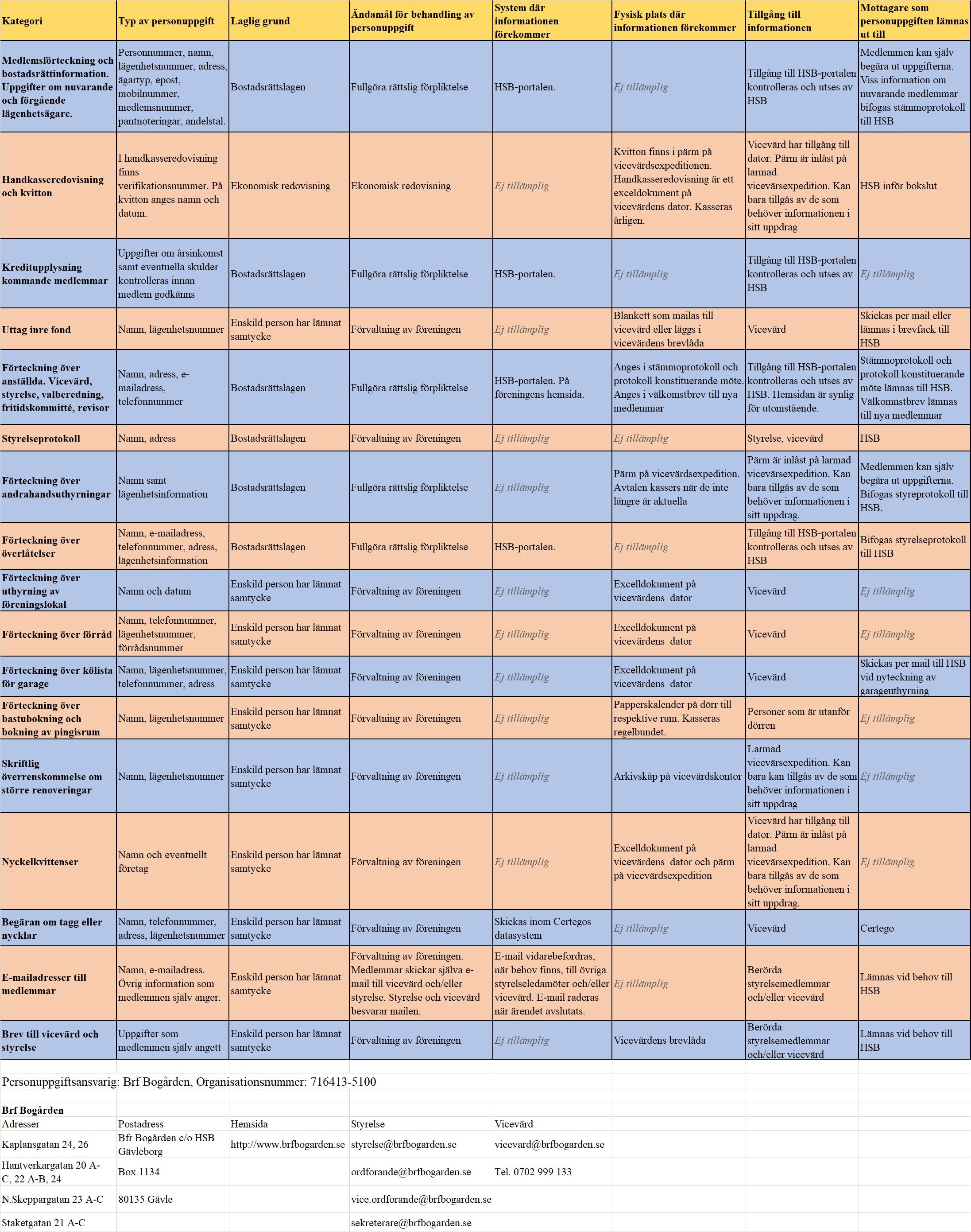 Vi har fått dina uppgifter från HSB, och liknande. Vi tillämpar vid var tid gällande integritetslagstiftning vid all behandling av personuppgifter. Den rättsliga grunden för att behandla dina personuppgifter är enligt Bostadsrättslag, stadgar med flera. Dina uppgifter kommer att sparas under den tid du är skriven som medlem i föreningen.