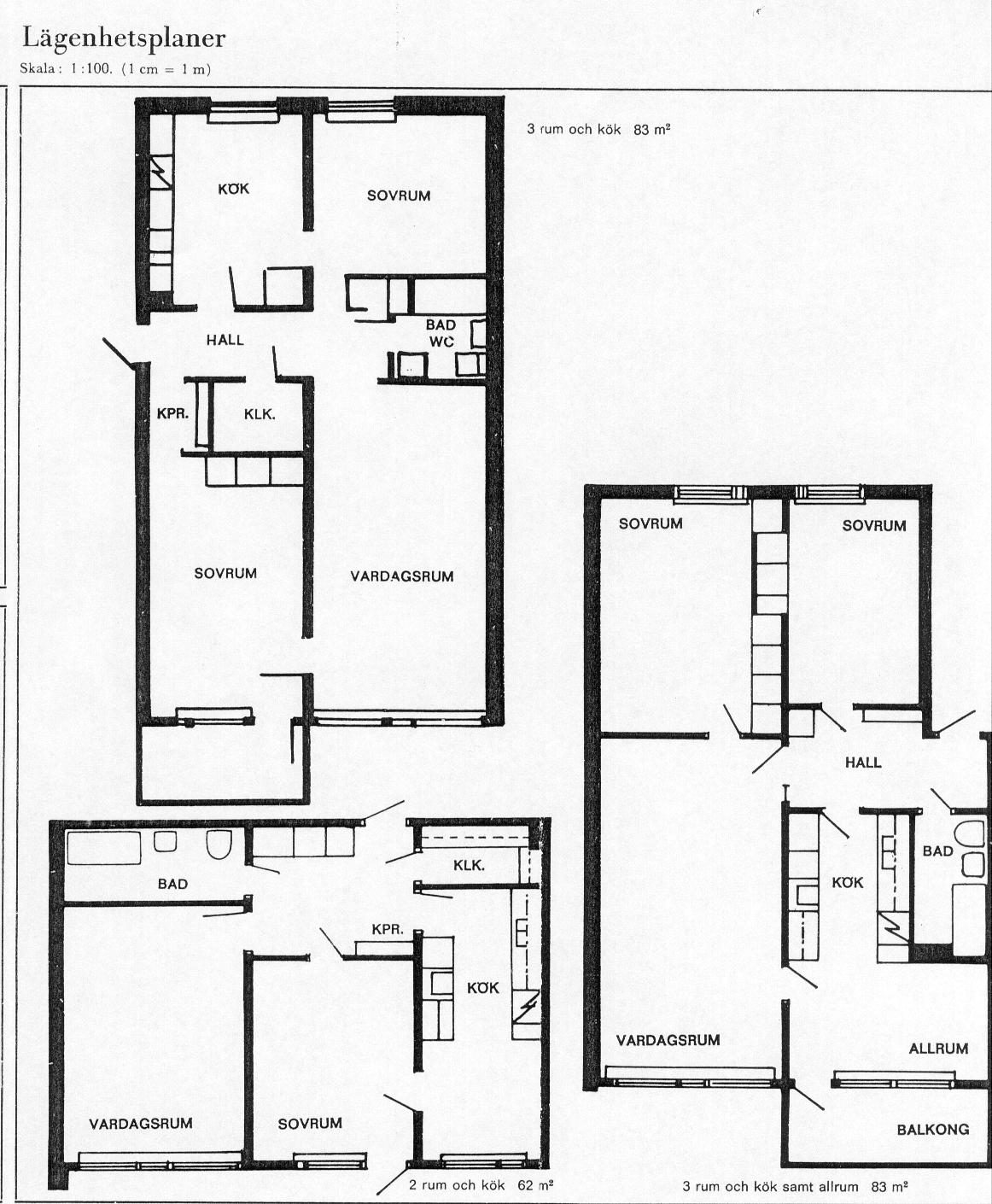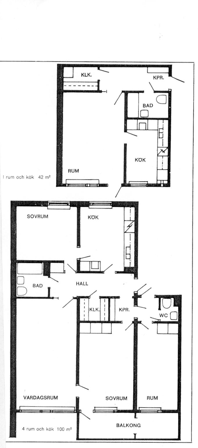 I huvudsak förekommer två lägenhetstyper, en med långsmalt s k L-kök i vinkel och en typ med ett något mindre fyrkantigt kök..