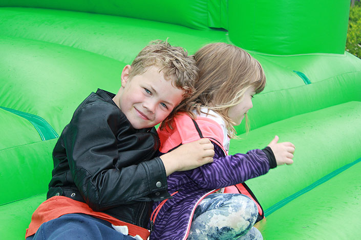 Sebastian, 7 år, passade på att leka i hoppborgen med lillasyster Amanda, 4 år, under överseende av mamma Jannica Marklund.