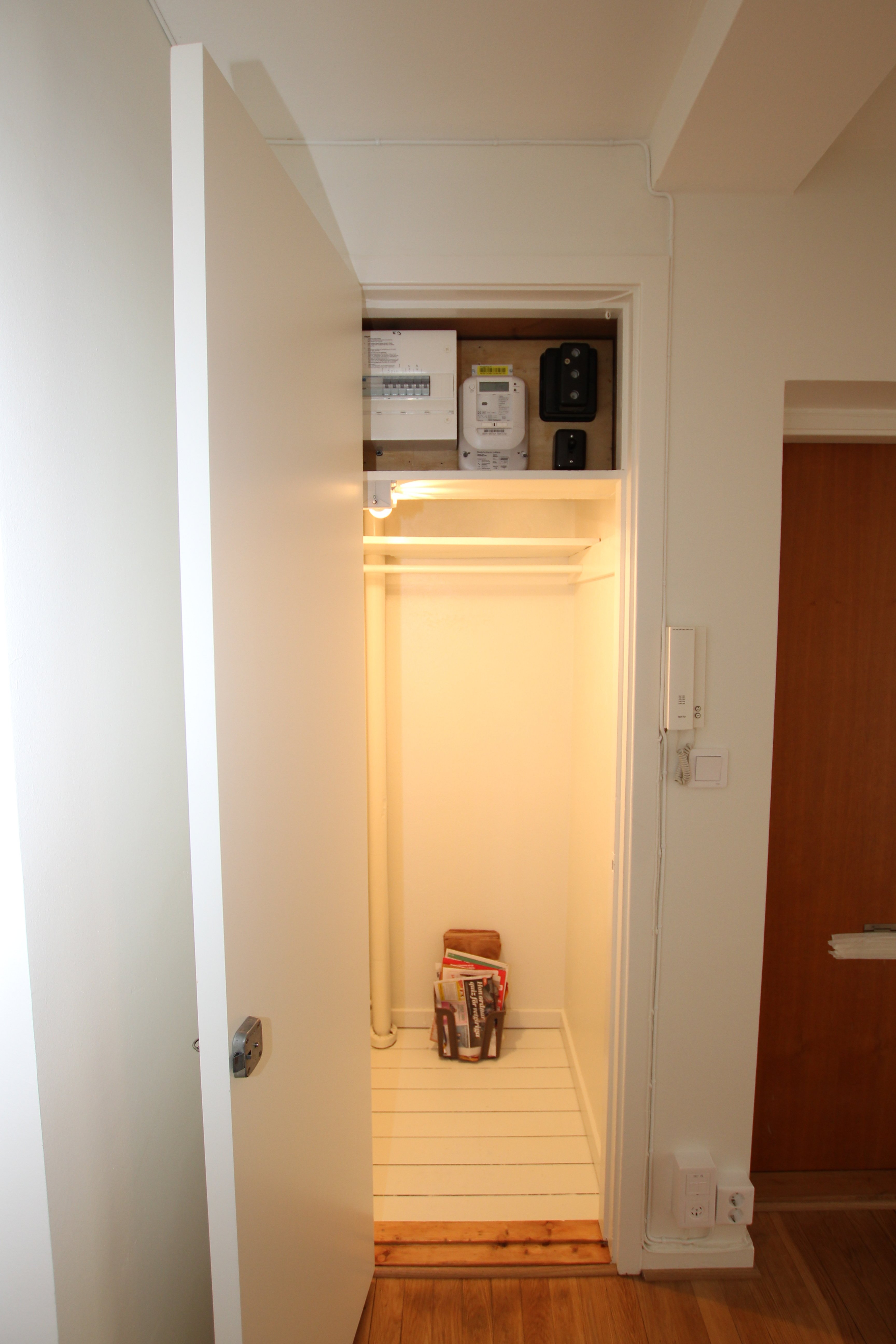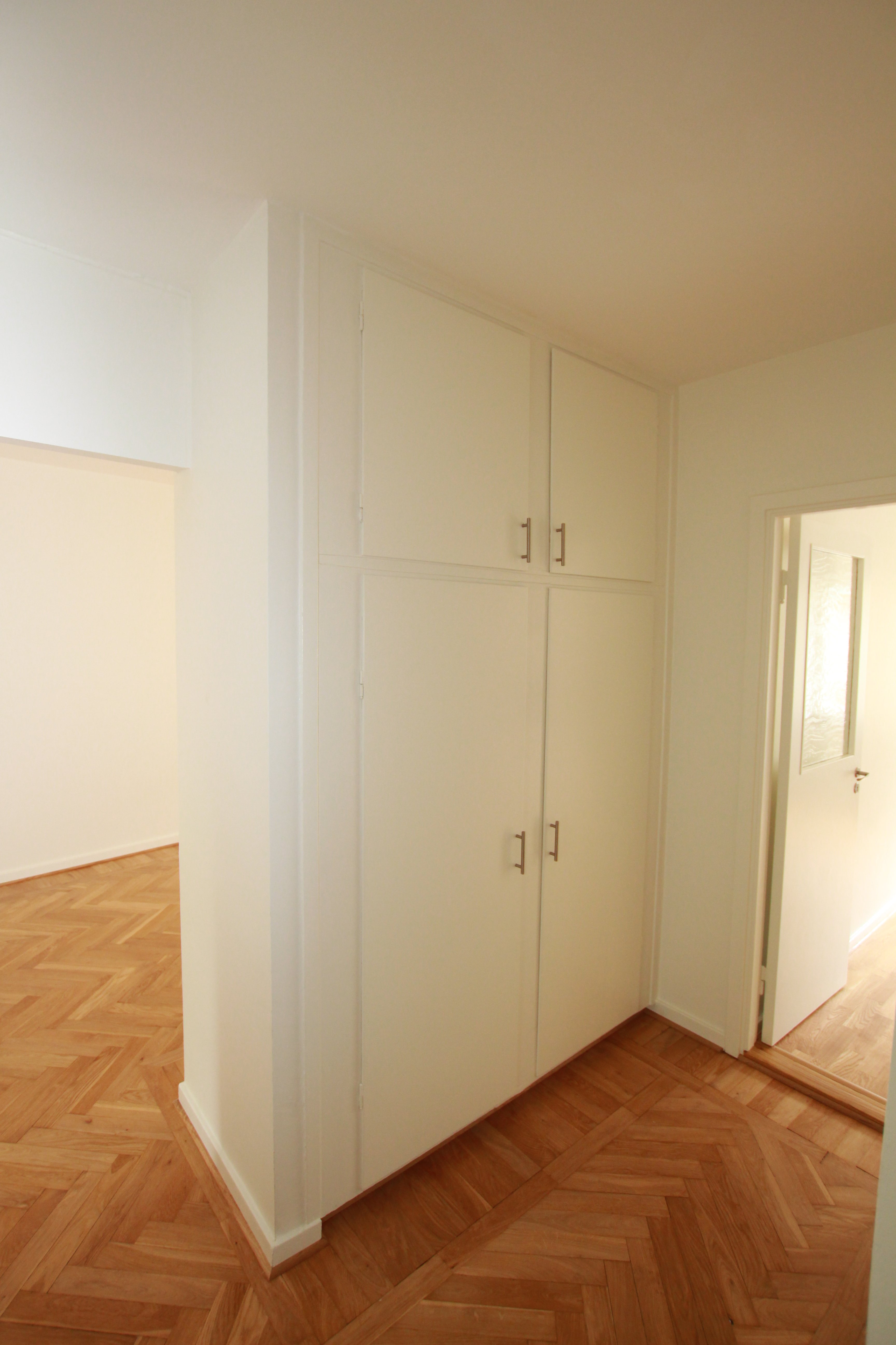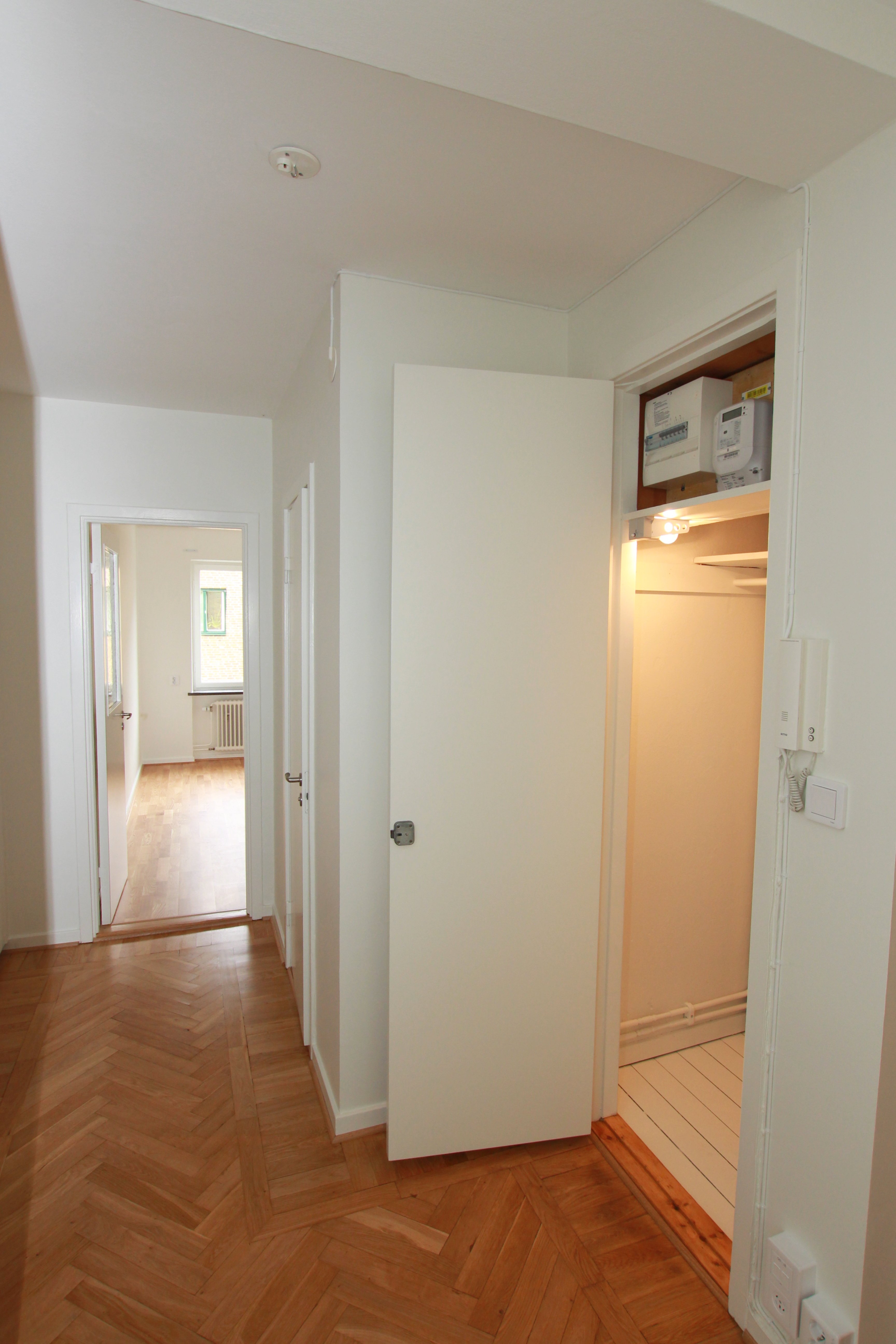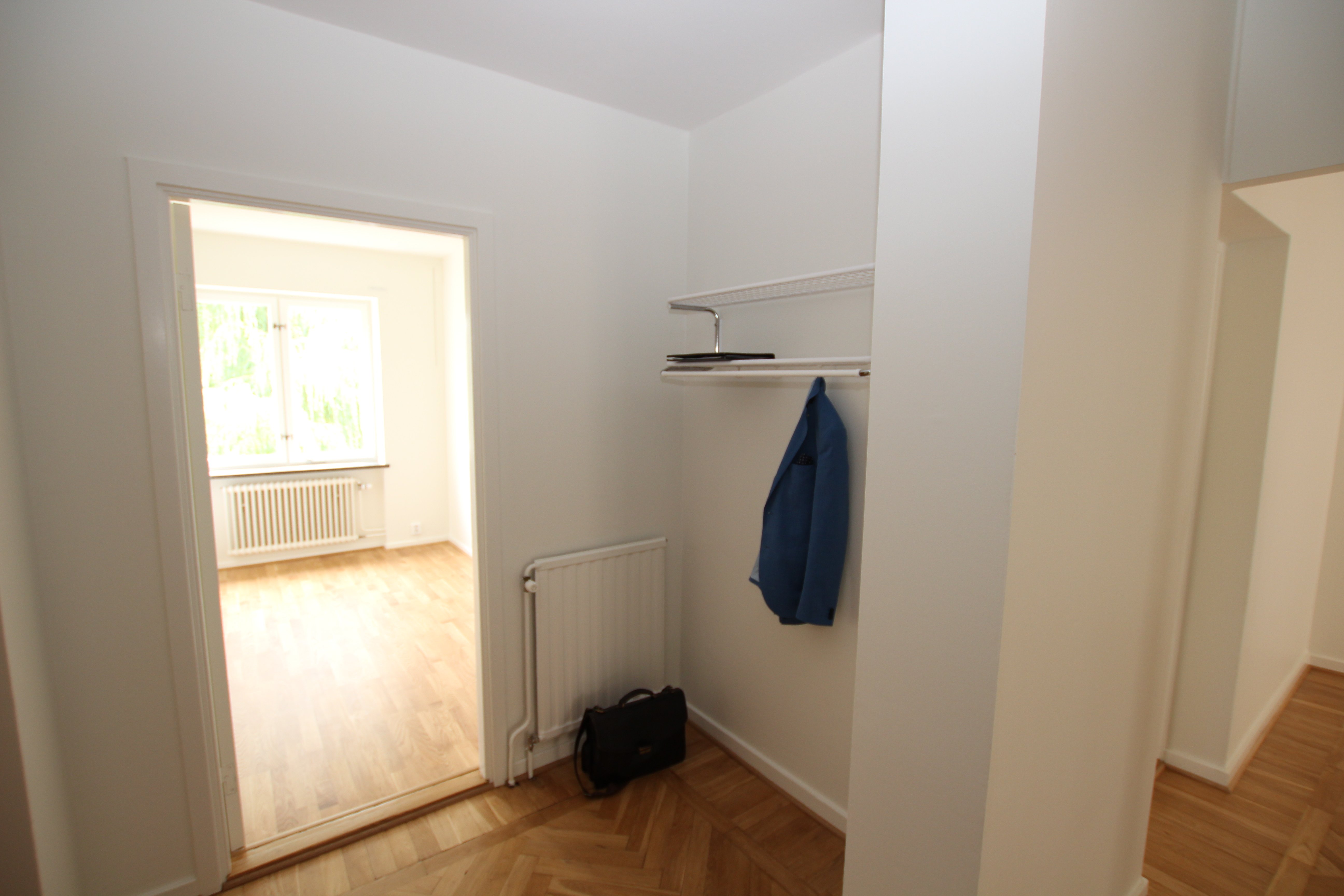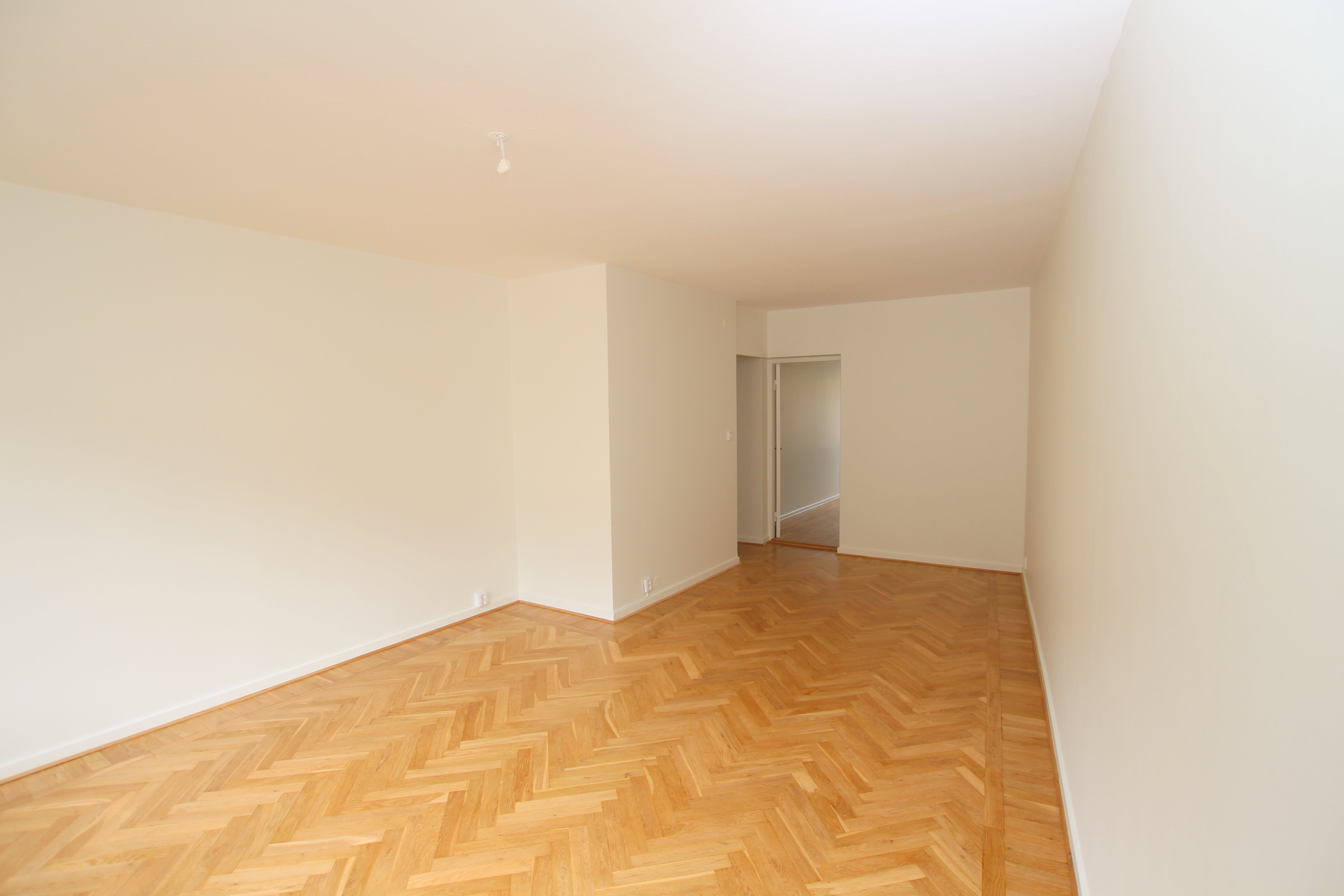 Vitmålade väggar och nyinlagda trägolv.