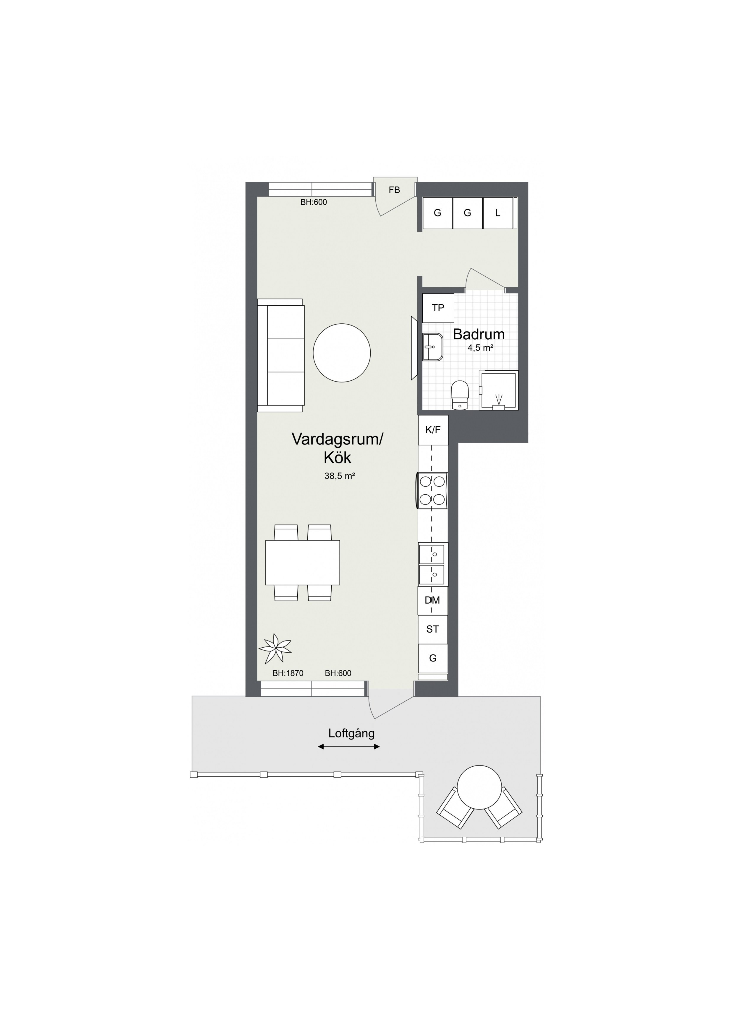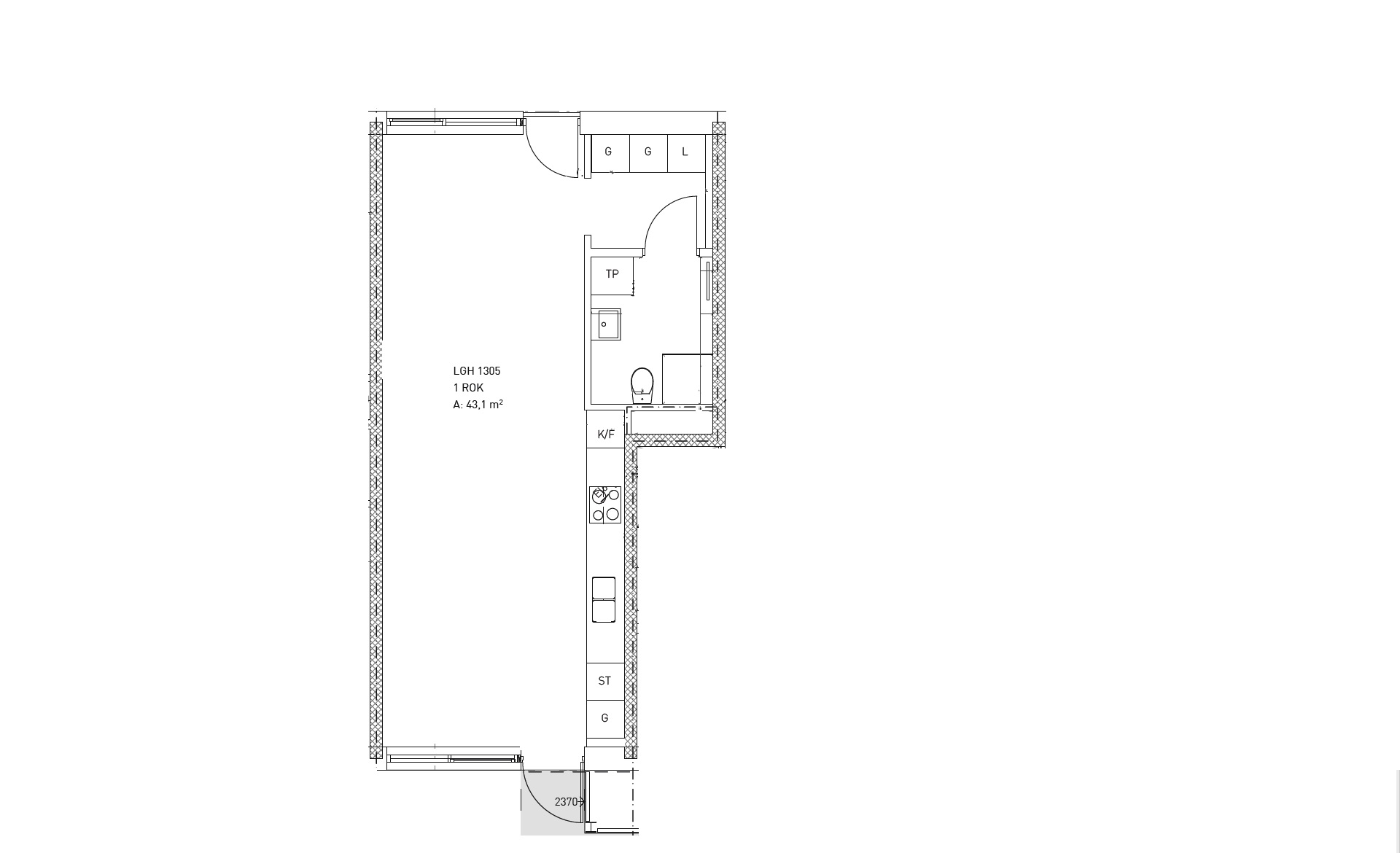 Alla lägenheter är genomgående och har en öppen planlösning. Väggarna är vitmålade och vi har valt ekparkett i alla rum förutom badrummet, där det ligger ett grått klinkergolv. Badrummen är helkaklade. Samtliga lägenheter är utrustade med spishäll, ugn i bänkskåp samt kombinerad kyl och frys.