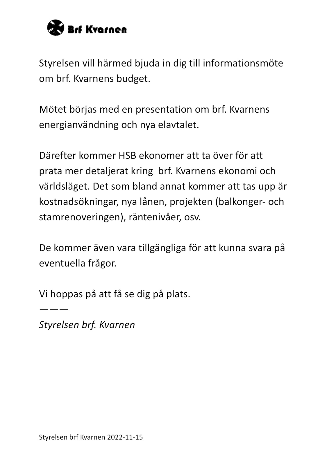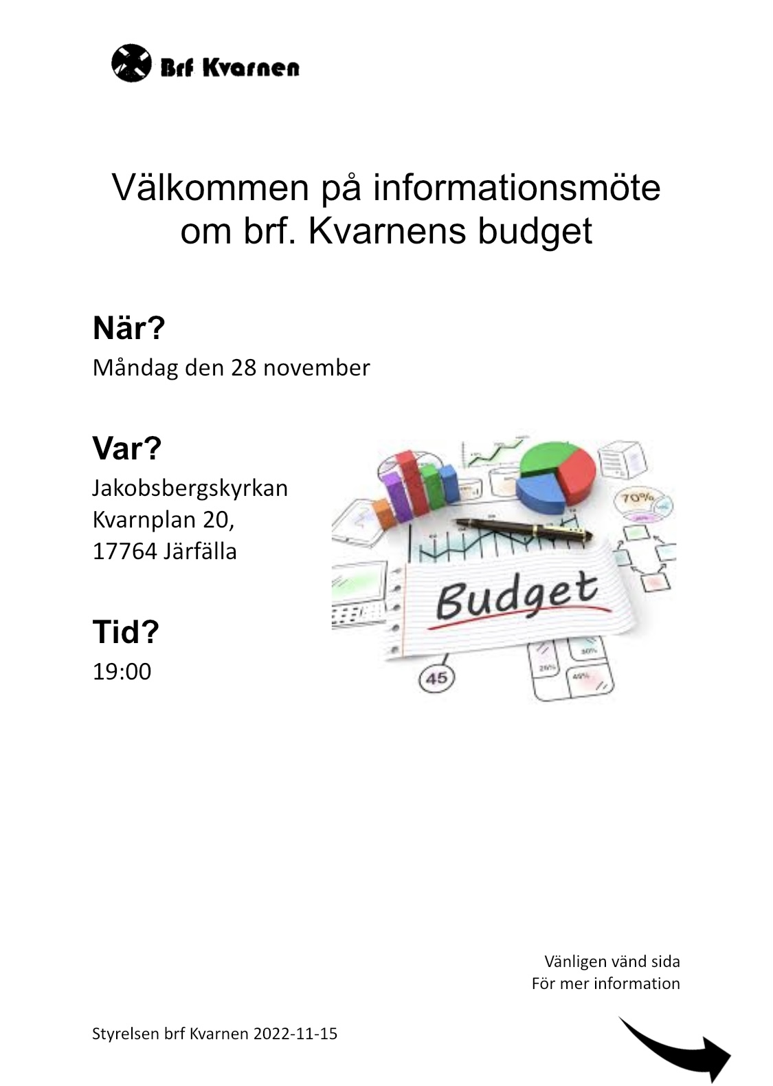 Kallelse till informationsmöte om brf. Kvarnens budget - baksidan