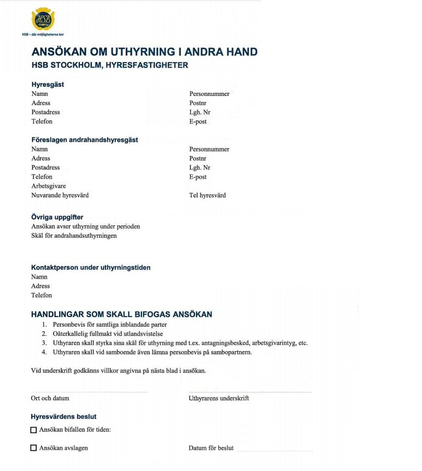 Blanketter för andrahandsuthyrning finns nedan. Ansökan ska sändas in till HSB i god tid före hyresförhållandet. På ansökan ska det tydligt framgå varför lägenheten ska upplåtas, till vem och för hur lång tid. Du behöver alltid styrelsens tillstånd (7 kap 10 § Bostadsrättslagen) och det ges för högst ett år i taget. Styrelsen beviljar i princip sammanlagt högst tre års andrahandsupplåtelse. Det är samma norm som Hyresnämnden tillämpar.