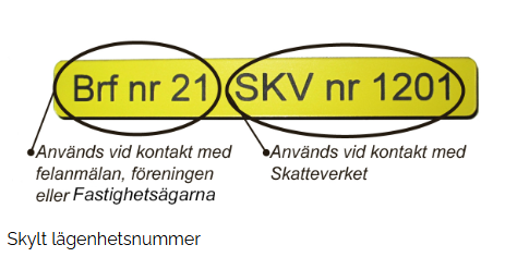 Vid all kontakt med föreningen eller Fastighetsägarna ska lägenhetsnumret finnas till hands. Detta är en (1) till tre (3) siffror. Brf nr XXX. Skatteverkets (SKV) nummer är alltid fyra (4) siffror och har inget med föreningen att göra utan är endast avsett för din folkbokföring. Ovanför varje lägenhetsdörr finns en skylt med dels föreningens lägenhetsnummer dels SKV-numret. SKV-numret ska anges vid in eller utflyttning och i andra kontakter med skatteverket.