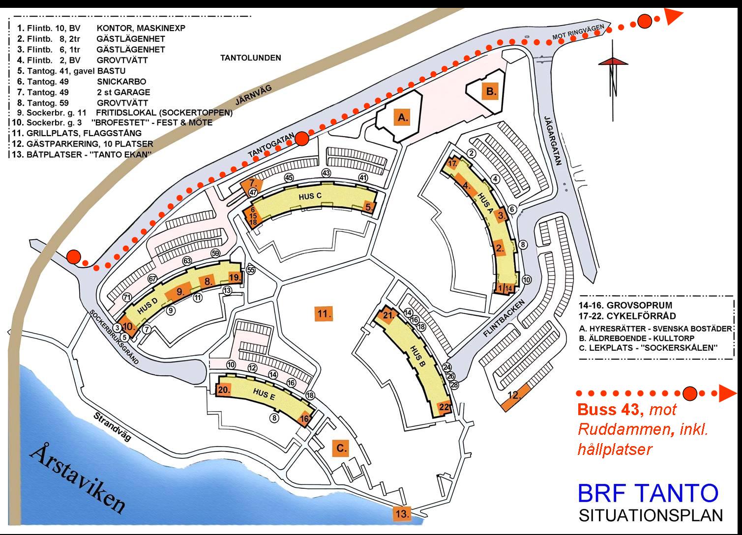Hus A och B har adress Flintbacken, Hus C och D ligger på Tantogatan och Hus E på Sockerbruksgränd.
