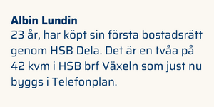 – Nu ser jag framemot inflytt 2024, det känns inte längre fruktansvärt långt bort! Sen är min plan att bo i den här lägenheten rätt länge och förhoppningsvis kunna köpa ut HSB efter fem år. Det känns också bra att inte vara uppbunden, om livet förändras kan jag trots allt sälja lägenheten när jag vill.