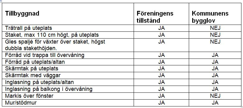 Kolla i tabellen nedan vilka tillstånd du behöver. Gör en skiss/beskrivning på det du vill göra och lämna den till hemmavicevärden eller någon styrelsemedlem. Om du får föreningens skriftliga tillstånd kan du sedan gå till kommunens byggnadsnämnd för att söka om deras bygglov, i de fall du behöver sådant.
