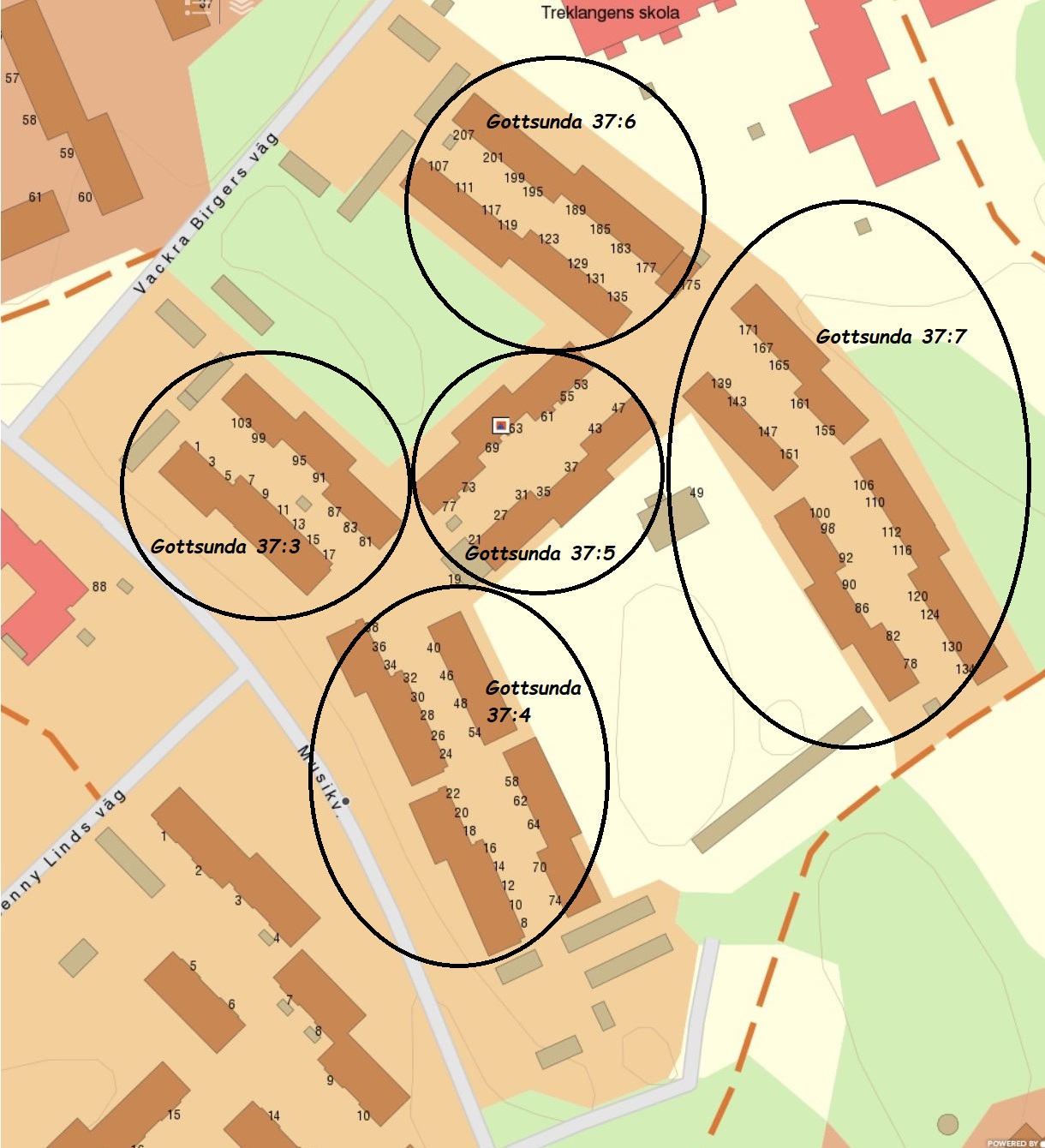Vackra Birgers väg 1-207 (udda nr) och Musikvägen 8-134 (jämna nr)